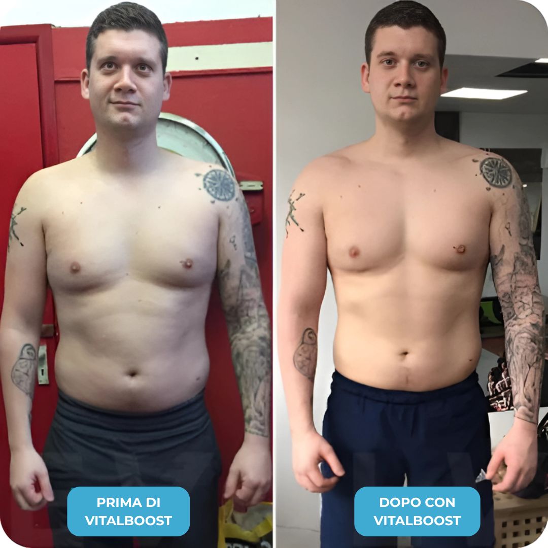Con Vitalboost sono finalmente riuscito a eliminare la mia pancia da birra e il grasso sul petto di cui mia moglie mi parlava sempre. Ora ho perso 13 kg in 2 mesi. Mi sento meglio e più sicuro di me!